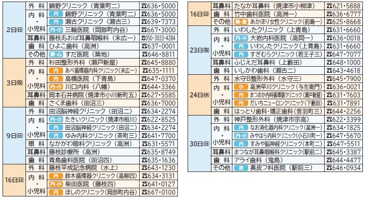 診療時間:午前9時〜午後5時(焼津市の耳鼻科は午前8時30分から、歯科は午後3時まで)