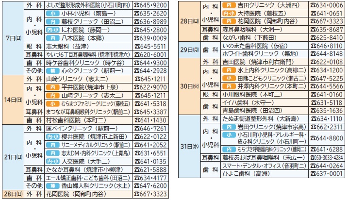 診療時間:午前9時〜午後5時(焼津市の耳鼻科は午前8時30分から、歯科は午後3時まで)