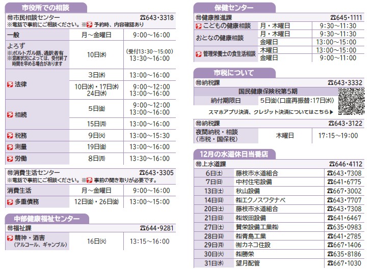 くらし 12月の相談窓口 30/34 前の記事 次の記事 発行日 : 2025年11月05日 自治体名 : 静岡県藤枝市 広報紙名 : 広報ふじえだ 令和7年11月号 ※相談料は無料。[予]は要予約。祝・休日はお休みです。 ※市役所での相談で、手話通訳を希望する人は、事前にご相談ください。 Tweet シェアする 志太・榛原地域救急医療センター 図書館とぴっくす