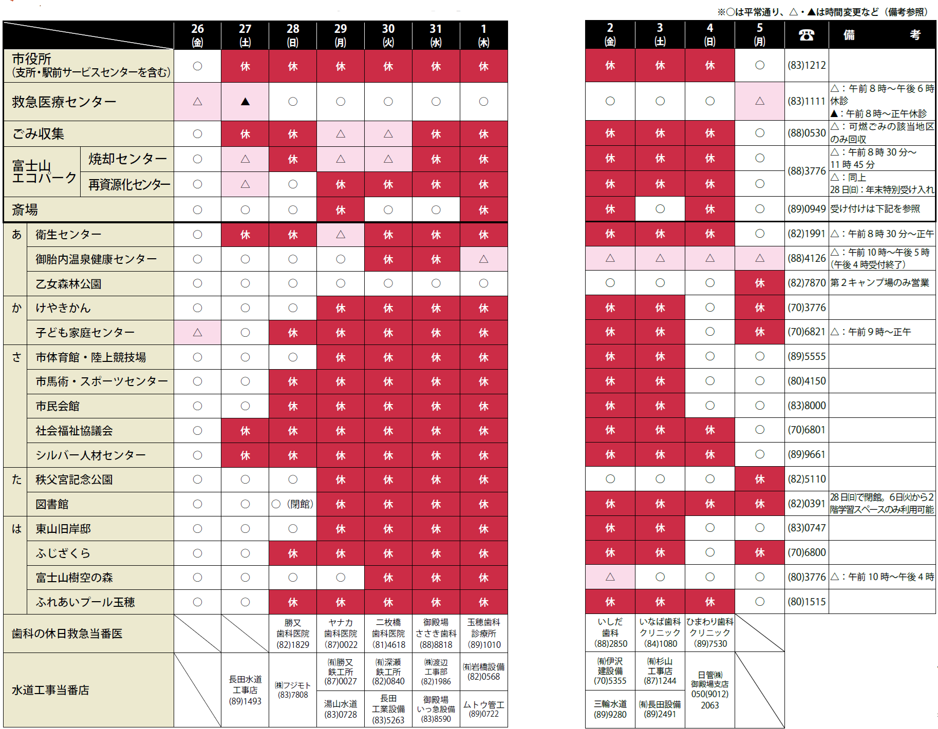 27日(土)から1月4日(日)までの間、午前7時から午後10時まで、火葬などの予約は、市役所地下1階の守衛室【電話】83-1212 で受け付けます。