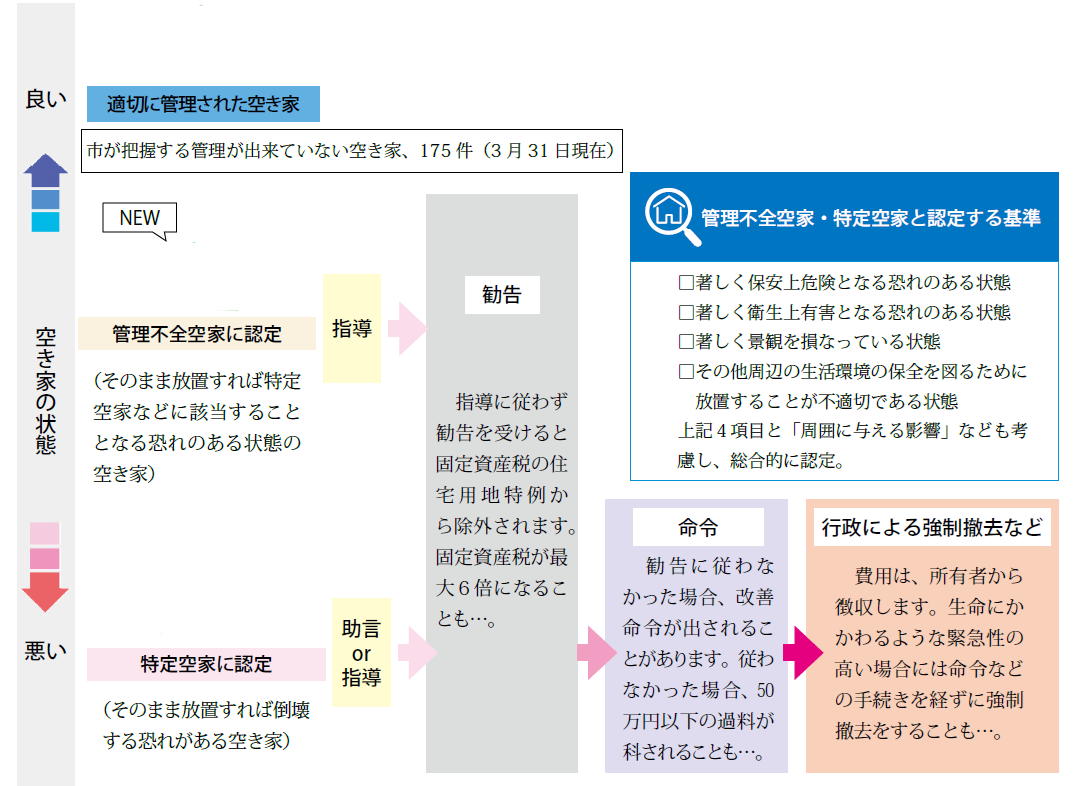 令和5年の「空家等対策の推進に関する特別措置法」改正により、「特定空家等」に加え、適切に管理されていない「管理不全空家」も所有者に指導などを行う対象となりました。この法改正により市でも「市空家等対策計画」を見直しています。