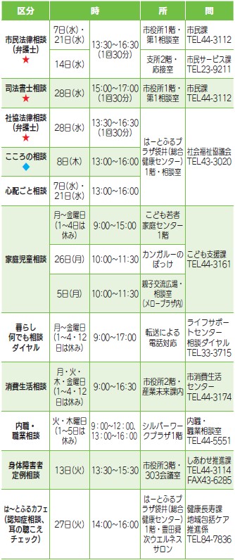 ★…要予約 相談日の1週間前の午前8時30分から。電話可。市内在住の方で、1人年度内1回