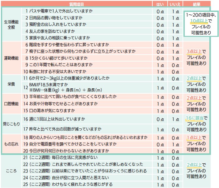 まずは、下のチェックリストで自身の生活を振り返り、心や体の機能で弱っているところがないかをチェックしてみましょう。指定の点数以上になった方は、「フレイル」の可能性があります。フレイルとは、加齢により心身の機能が低下して「健康」から「要介護」に移行する中間の段階のことです。