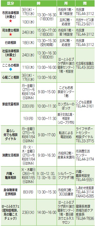 ◆…要予約 相談日の1週間前の午後5時まで