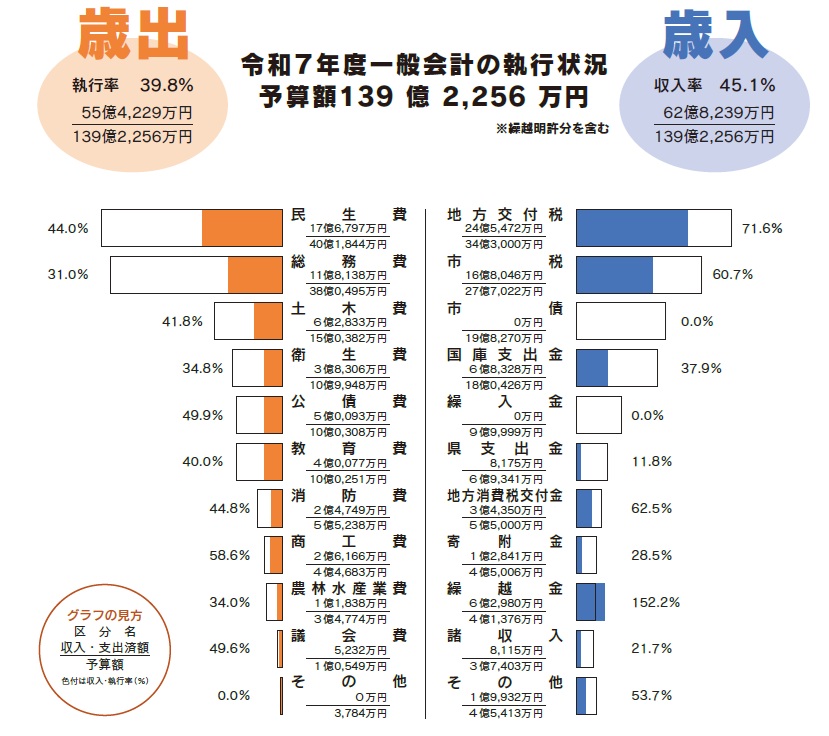 令和7年9月末現在の、各会計の収入、執行状況は次のとおりです。負担金や使用料・手数料など、歳入の確保に努めるとともに、歳出では効率的な執行を図りながら、これまでと同様、財政の健全化に努めていきます。