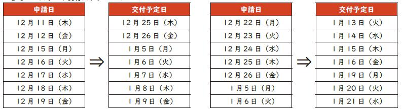 年末年始に申請をしますと、パスポートの受け取りまで通常より日数がかかります。余裕をもって、早めに申請をお願いします。申請後の交付予定日(受取可能な目安)は、下記のとおりです。