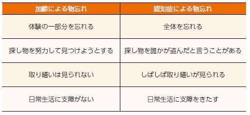 加齢による自然な物忘れは、体験したことの一部分を忘れてしまいますが、認知症による物忘れは「いつ、どこで、何を」といった出来事や体験を全て忘れてしまう特徴があります。出来事の記憶を忘れてしまうため、「何度も同じことを言う」「決められた日を間違える」といったことが起こります。また、財布などをしまった体験自体を忘れてしまうため、「財布が盗まれた」と思い込むことがあります。