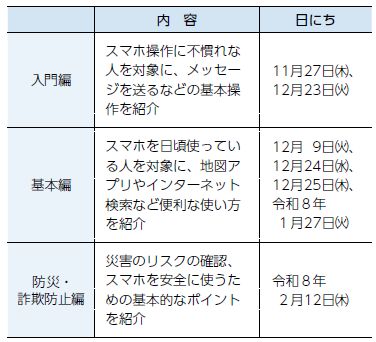 ■入門編、基本編、防災・詐欺防止編の3講座を開催