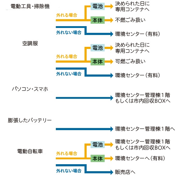 乾電池、リチウムイオン電池、充電式電池、充電式の小型家電(電池内蔵型の以下の9品目)は燃やせないごみではありません。ごみ分別収集カレンダーやごみ分別アプリで確認しながら、決められた日に決められた方法で出しましょう。