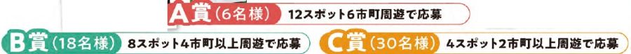 集めたスタンプと周遊した市町数によって、プレゼントの抽選に応募できます。すべての賞に応募することも可能です。1つのスポットでスタンプを取得できるのは、1回のみ。6市町のお店や観光スポットを巡って当選確率をアップしましょう!