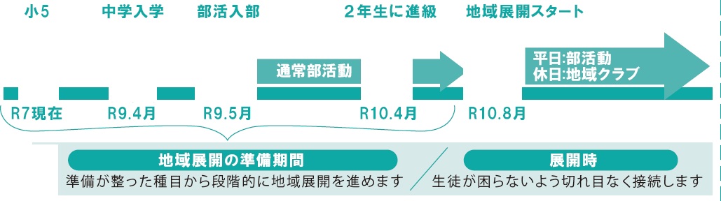 令和10年8月末には地域クラブと連携した休日の地域展開をスタートします。