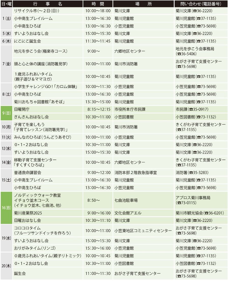 ※ 現在掲載中の行事などが中止・延期になる場合があります。開催の有無については、市ホームページをご覧いただくか、各問い合わせ先に確認ください。