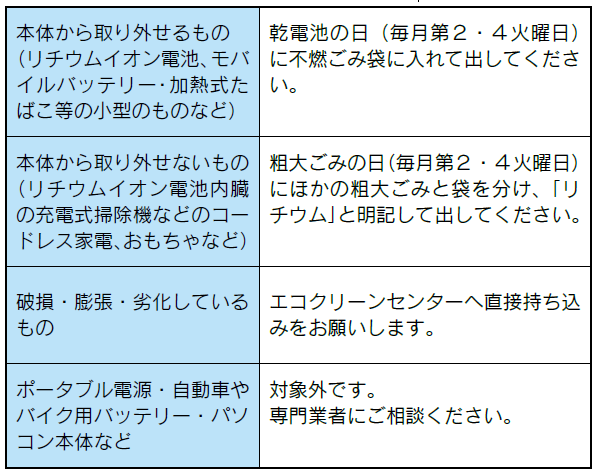 ■燃えるごみに混ぜないで リチウムイオン電池は乾電池・粗大ごみの日に(第2・4火曜日)