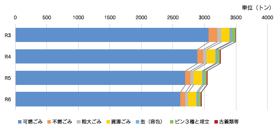 可燃ごみ処理手数料有料化から3年、皆さまのご協力のおかげで令和6年度のごみの排出量は、2952.11t、前年比96.95%でした。皆さんのごみの分別や、家庭用資源ごみリサイクルステーションの利用により、可燃ごみ処理手数料の有料化を開始した令和4年度から毎年減少傾向にあります。引き続き減量にご協力をお願いします。