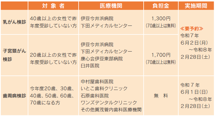 乳がん、子宮頸がん検診、歯周病検診を実施しています。対象の方には、郵送にてお知らせしましたので、この機会にぜひ受診しましょう。