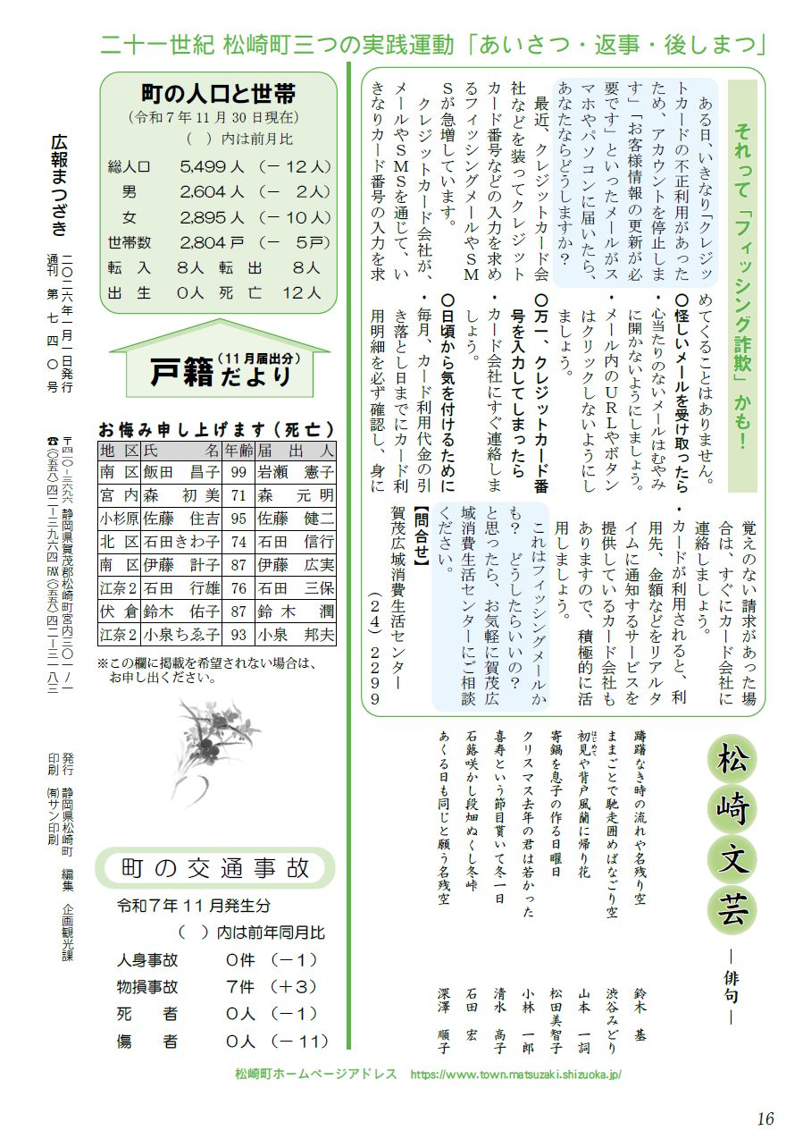 その他 広報まつざき 2026年1月号 P.16 16/16 前の記事 発行日 : 2026年01月01日 自治体名 : 静岡県松崎町 広報紙名 : 広報まつざき 2026年1月号 Tweet シェアする 広報まつざき 2026年1月号 P.15