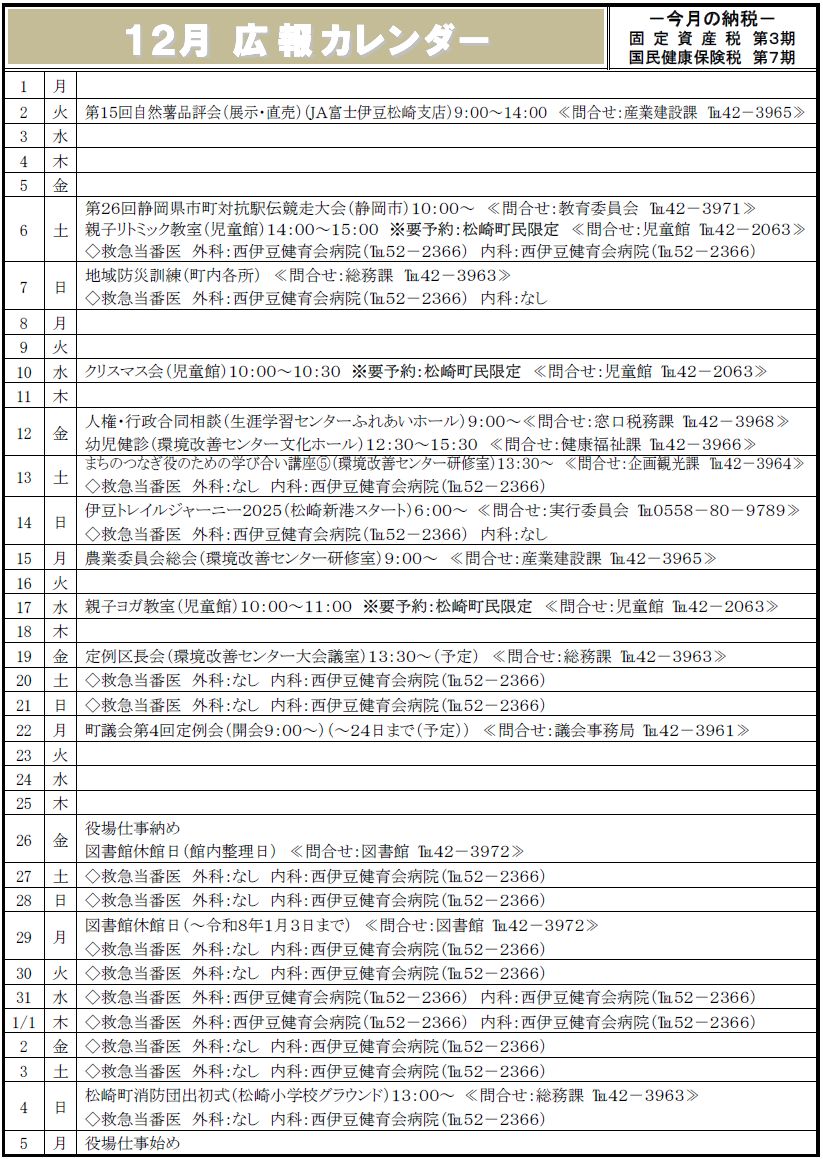 くらし 12月広報カレンダー 6/7 前の記事 次の記事 発行日 : 2025年11月27日 自治体名 : 静岡県松崎町 広報紙名 : 広報まつざき お知らせ版 第482号 令和7年11月27日(木) ※このスケジュールは予定ですので、変更になる場合があります。 Tweet シェアする 松崎町職員採用試験(社会人経験者・随時採用) その他のお知らせ(広報まつざき お知らせ版 第482号 令和7年11月27日(木))