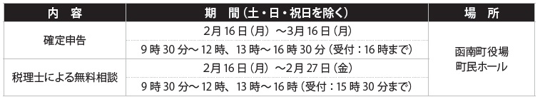 ▽函南町役場会場では、消費税、贈与税、相続税の相談、青色申告、譲渡所得(株式等譲渡所得を含む)、山林所得、配当所得、肉用牛の売却による農業所得の受け付けは行いません。その他内容によっては役場会場で申告できない場合があります。