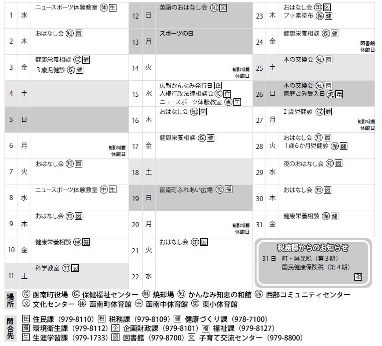くらし 10月カレンダー 35/39 前の記事 次の記事 発行日 : 2025年09月12日 自治体名 : 静岡県函南町 広報紙名 : 広報かんなみ 令和7年9月号 同報無線テレフォンサービス(24時間無料) 【電話】0120-652-505 (同報無線で放送した内容を聞き逃した場合に放送内容を電話で確認することができます) Tweet シェアする お知らせページ information【募集】 10月休日当番医・夜間診療医