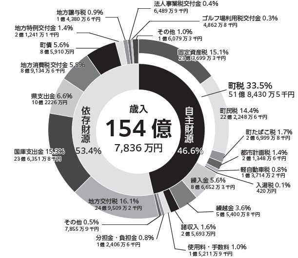また、町税や使用料など町が収入するお金(自主財源)は歳入全体の46・6%で、地方交付税や国・県からの補助金、町債などにより収入するお金(依存財源)は、歳入全体の53・4%を占めています。