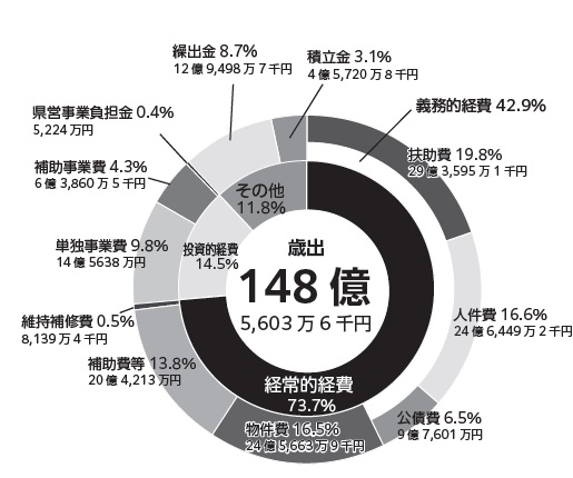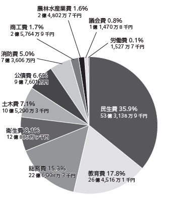 目的別の区分で、歳出全体に占める比率のもっとも大きいのが民生費の53億3138万9千円で、全体の35・9%を占めています。これは、心身障害者、高齢者、児童福祉に係る費用で、医療費の助成や各種福祉サービスの提供、保育園の運営などに要した費用です。