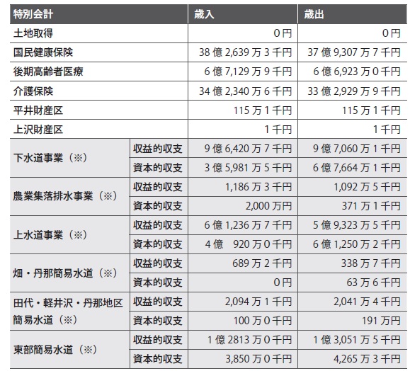 特定の事業を行う12の特別会計(土地取得、国民健康保険、後期高齢者医療、介護保険、平井財産区、上沢財産区、下水道事業、農業集落排水事業、上水道事業、畑・丹那簡易水道、田代・軽井沢・丹那地区簡易水道、東部簡易水道)の歳入・歳出決算額は次の表のとおりです。