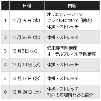 最近、体の衰えを感じている人、家で過ごすことが多い人、何かやりたいけど何からやろうか迷っている人にぴったりな教室です。専門職が効果的なフレイル予防をお伝えします。