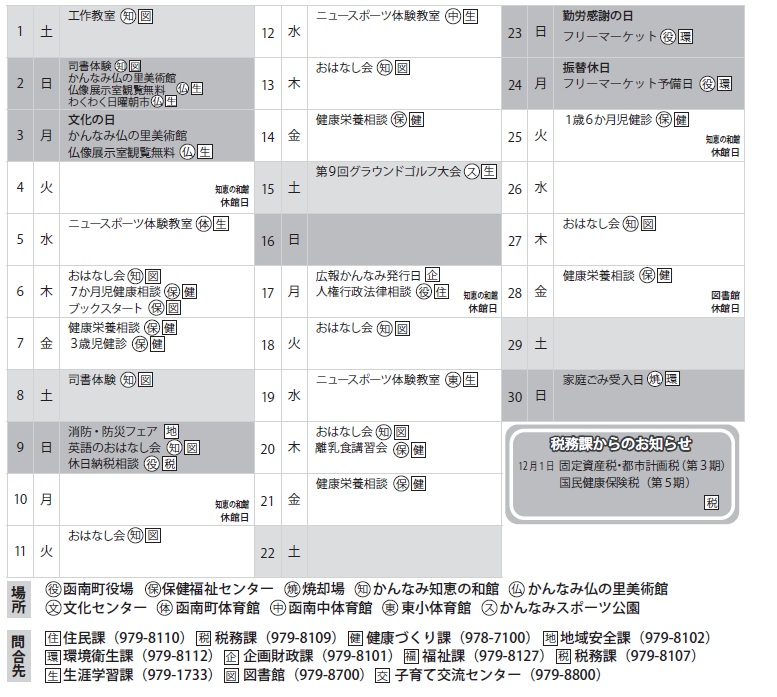 くらし 11 月カレンダー 31/36 前の記事 次の記事 発行日 : 2025年10月15日 自治体名 : 静岡県函南町 広報紙名 : 広報かんなみ 令和7年10月号 同報無線テレフォンサービス(24時間無料) 【電話】0120-652-505 (同報無線で放送した内容を聞き逃した場合に放送内容を電話で確認することができます) Tweet シェアする お知らせページ information【募集】 11月休日当番医・夜間診療医