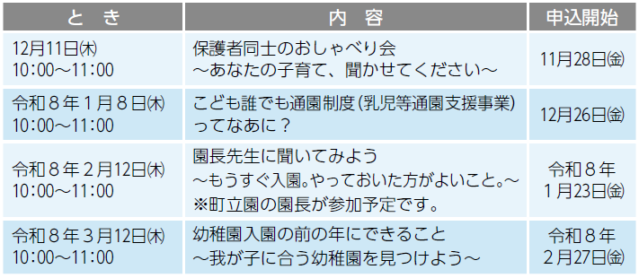 内容:入園前の親子の交流や保護者の友達づくり、子育ての悩み相談、情報交換、幼稚園・保育園・認定こども園の紹介と入園までの流れなど