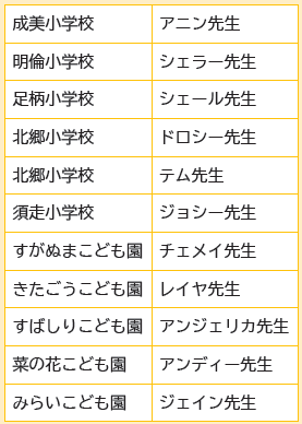 現在町では、町内の全中学校、小学校、放課後児童クラブ、こども園(私立含む)にそれぞれ1人以上のALT(外国語指導助手)を配置しています。※1