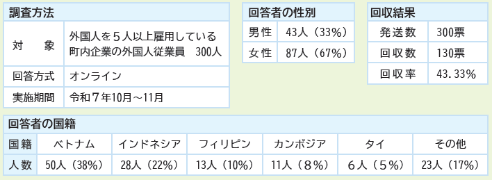 これからも本町に住み、働く外国人の人口は増加傾向にあるため、様々な国籍の外国人を対象に生活や就労などの実態や困りごと、共生に関する意識などを調査しました。