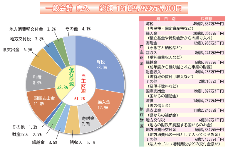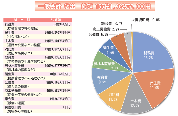 総務費は36億914万円で全体の23・2%、民生費は29億4296万9千円で全体の19・0%、これらが全体の大きな割合を占めました。
