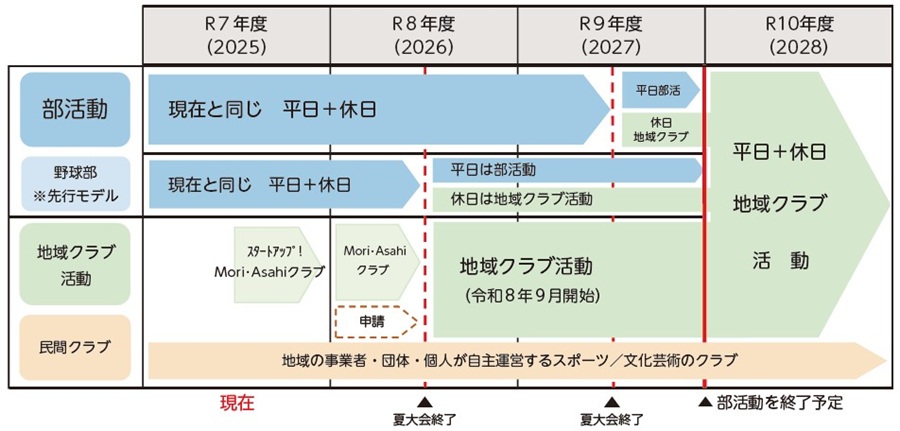令和8年9月からの地域クラブ活動へのスムーズな移行と、生徒の活動機会を継続して確保することを⽬的に、令和8年4月から8月までは教育委員会が、「Mori・Asahiクラブ」を実施します。令和7年度のトライアル事業終了後も、生徒が継続して活動できる環境を整え、9月からの地域クラブ活動へ移行していきます。