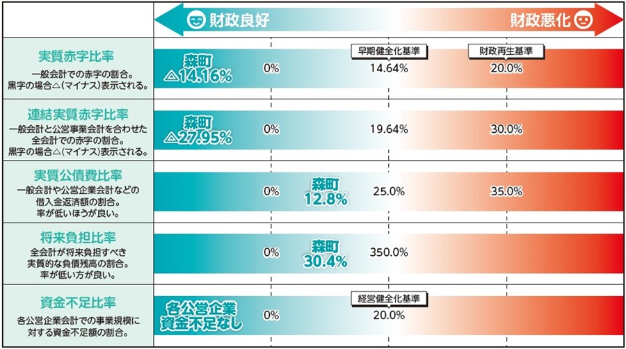 下のグラフは森町の財政運営の健全性を示したものであり、森町は全ての指標で健全化の基準を満たしており、町財政は健全といえます。