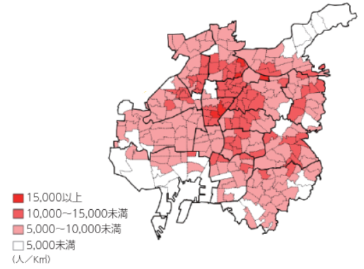 学区別人口密度:15,000以上から5,000未満まで