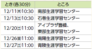 とき:(1)12/13(土)13:30~14:00(2)12/14(日)10:30~11:00