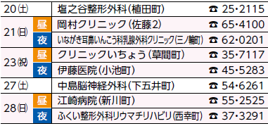 時間:平日/20:00〜24:00、休日/8:00〜24:00※要事前電話 左記時間帯以外は市民病院(【電話】33-6111)