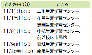 申込み:11/5(水)~11/20(木)に図書館ホームページで必要事項を入力※直接または電話で中央図書館でも申し込み可