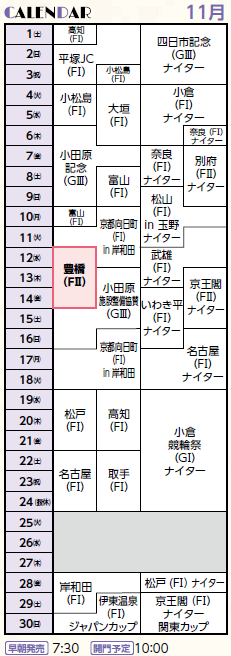 競輪祭(GI)が小倉競輪場で11月19日(水)から11月24日(振休)に開催されます。小倉は競輪発祥の地で、バンクは豊橋と違い、屋内型で天候の影響を受けず、傾斜が大きいためスピードが落ちにくいことが特徴です。豊橋競輪場でも場外発売を行いますので、年末のグランプリ出場選手が決定する今年最後のGIレースを豊橋競輪場で楽しみましょう。