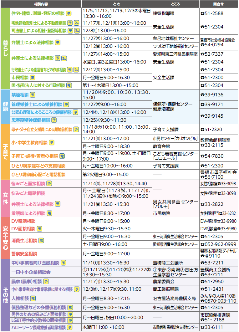 くらし 相談 29/34 前の記事 次の記事 発行日 : 2025年11月01日 自治体名 : 愛知県豊橋市 広報紙名 : 広報とよはし 令和7年11月号 相談内容は秘密厳守します。気軽にご相談ください。 定員があるものや申し込みが必要なものがあります。詳細はお問い合わせください。 Tweet シェアする 暮らし情報ーその他(3) 【市長のコラム】ホっと一息