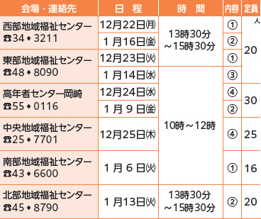 申込:(1)(3)12月10日(水)(2)12月12日(金)9時から電話で高年者センター岡崎(【電話】55-0116)へ。