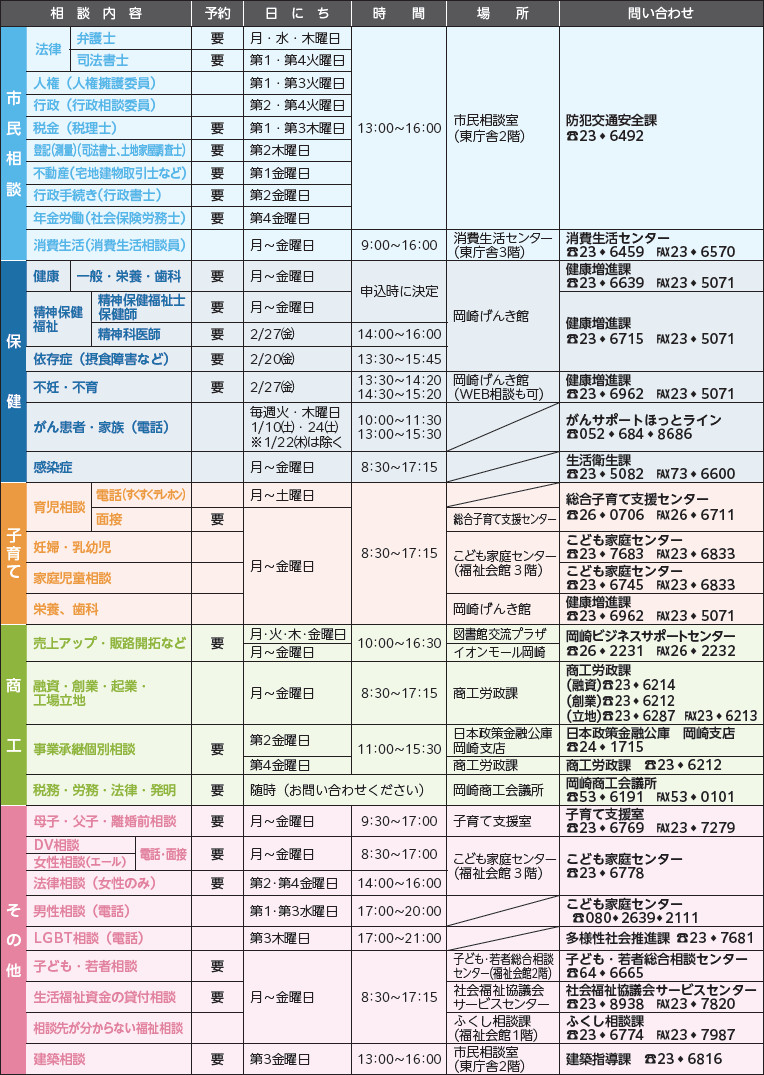 くらし 相談 37/43 前の記事 次の記事 発行日 : 2026年01月01日 自治体名 : 愛知県岡崎市 広報紙名 : 市政だより おかざき No.1444 2026年1月号 相談内容は秘密厳守します。 「事前予約」が必要なものがあります。詳細は、お早めに問い合わせください。 ※年末年始、祝日は受け付けていない場合があります。 Tweet シェアする マチイロ マチを好きになるアプリ 【街角情報BOX】催し・講座 市民活動 発表会 サークル(1)