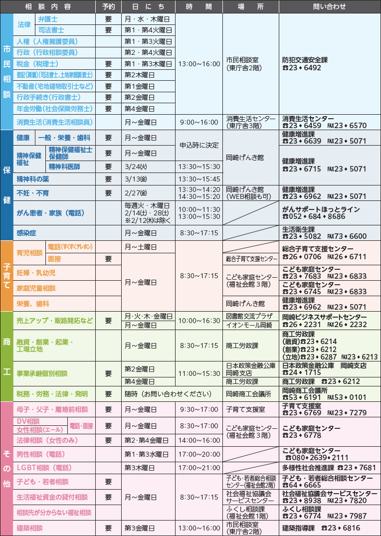 くらし 相談 41/47 前の記事 次の記事 発行日 : 2026年02月01日 自治体名 : 愛知県岡崎市 広報紙名 : 市政だより おかざき No.1445 2026年2月号 相談内容は秘密厳守します。 「事前予約」が必要なものがあります。詳細は、お早めに問い合わせください。 ※年末年始、祝日は受け付けていない場合があります。 Tweet シェアする 高額医療・高額介護合算療養費制度 街角情報BOX —催し・講座 市民活動 発表会 サークル— (1)