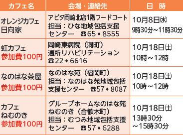 申込:市電子申請届出システムまたは往復はがきで、郵便番号、住所、氏名(ふりがな)、年齢、電話番号を、〒444-8601 長寿課「頭と体の認知症予防スクール」係へ。10月20日(月)必着