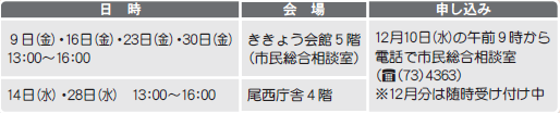 くらし 1月の法律相談(予約制) 18/45 前の記事 次の記事 発行日 : 2025年12月01日 自治体名 : 愛知県一宮市 広報紙名 : 広報一宮 2025年12月号 ID:1001955 裁判中・弁護士依頼済み事件の相談は不可。同居家族・同一事業所は月1回まで Tweet シェアする 【暮らしのトピックス】12月の無料相談 人事行政の運営などの状況を公表(1)