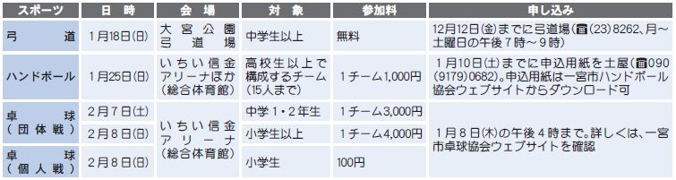 スポーツ 【スポーツ】スポーツ大会 26/45 前の記事 次の記事 発行日 : 2025年12月01日 自治体名 : 愛知県一宮市 広報紙名 : 広報一宮 2025年12月号 市内在住・在勤・在学の方が対象 スポーツ協会(スポーツ課内) 【電話】85-7078 いちい信金スポーツセンター(県一宮総合運動場) 【電話】77-0500 Tweet シェアする 情報BOX-教室(2) 【スポーツ】スポーツ教室