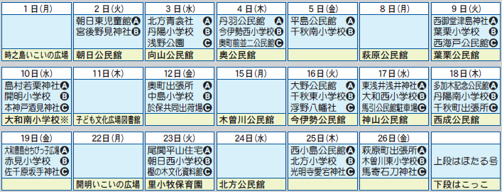くらし 12月 移動図書館ほたる号・移動子育て支援センターこっこ 42/45 前の記事 次の記事 発行日 : 2025年12月01日 自治体名 : 愛知県一宮市 広報紙名 : 広報一宮 2025年12月号 ■移動図書館ほたる号 ID:1012823 (A)10:15~11:00 (B)13:30~14:30 (C)15:00~16:00 ■移動子育て支援センターこっこ ID:1010631 10:00~15:00(※は14:00まで) ※悪天候で中止する場合があります。 Tweet シェアする 本を読もうよ! 二十歳のつどい