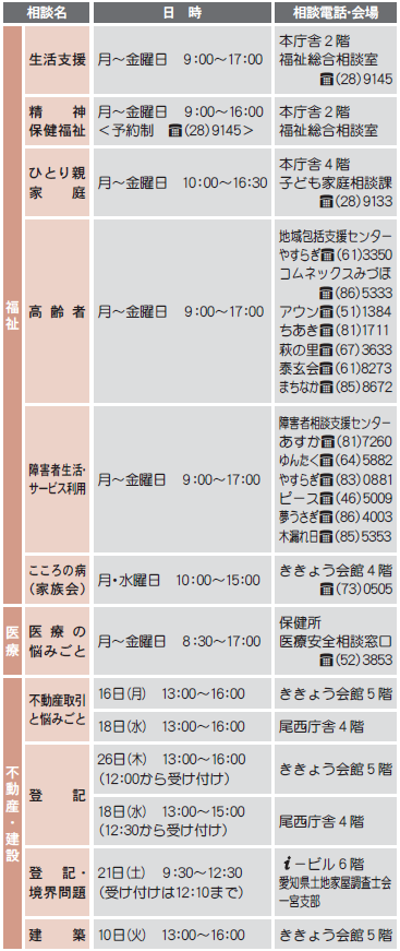 くらし 6月の無料相談 21/44 前の記事 次の記事 発行日 : 2025年06月01日 自治体名 : 愛知県一宮市 広報紙名 : 広報一宮 2025年6月号 ・電話番号がない相談は直接会場へ (先着順で受け付け。混雑状況により、相談できない場合あり) ・正午~午後1時に相談できない場合あり ID:1066682 Tweet シェアする 【防犯・交通安全】今月のポイント 7月の法律相談