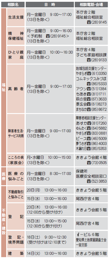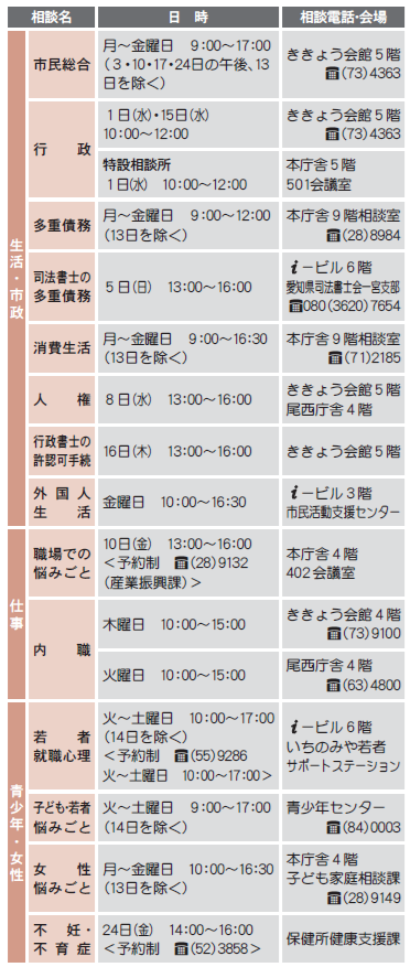 くらし 【暮らしのトピックス】10月の無料相談 28/57 前の記事 次の記事 発行日 : 2025年10月01日 自治体名 : 愛知県一宮市 広報紙名 : 広報一宮 2025年10月号 ◆電話番号がない相談は直接会場へ(先着順で受け付け。混雑状況により、相談できない場合あり) ◆正午~午後1時に相談できない場合あり ID:1067939 Tweet シェアする 【暮らしのトピックス】防犯・交通安全 今月のポイント 【暮らしのトピックス】11月の法律相談(予約制)