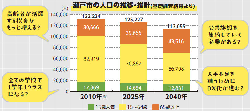 2040年を見据えて、人口が減少しても持続可能なまちづくりを目指すため、市民の皆さんをはじめ様々な形で瀬戸市に関わる方々にとっての『瀬戸での理想の暮ら応募締切:将来像』を描き、必要な取組を考えていきます。